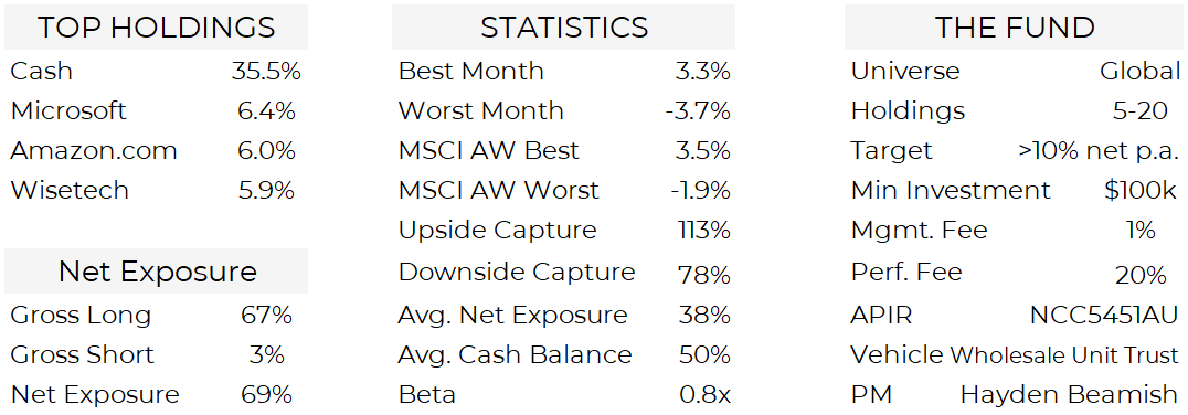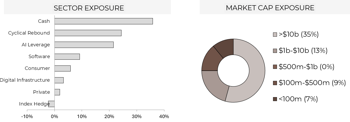At month end the fund held 19 long positions and one short (Palantir), with net exposure of 69% and approximately 36% cash. Downside protection included a Nasdaq put spread and gold put spread which are both out of the money.