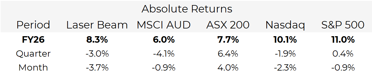 February's drawdown was driven by a sharp and unusually concentrated selloff in software and AI related equities. The MSCI ACWI (AUD) declined 0.9%, the S&P 500 declined 0.9%, the Nasdaq declined 2.3%, the ASX 200 increased 4%. The headline indices did not reflect the carnage beneath the surface which saw many individual software names experience recession like declines.