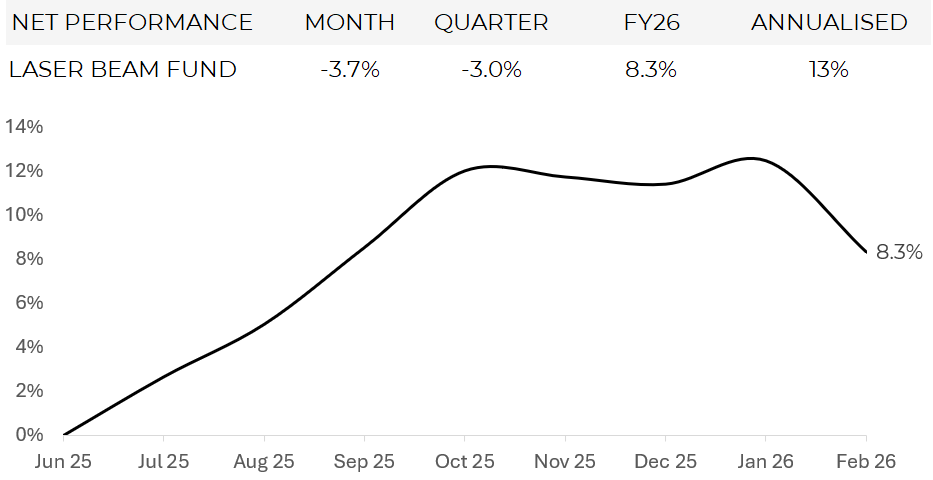 The fund declined -3.7% in February. Financial year to date the fund is up 8.3% net.