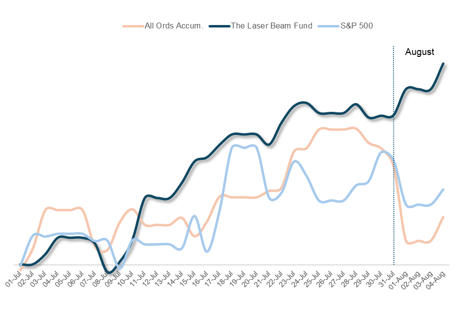 Towards the end of the month we locked in profits and increased our hedge. The hedging is insurance: it will not remove all risk, but it smooths the ride. Thanks to the hedging, on 1 August the Nasdaq dropped 2% and the fund was up.